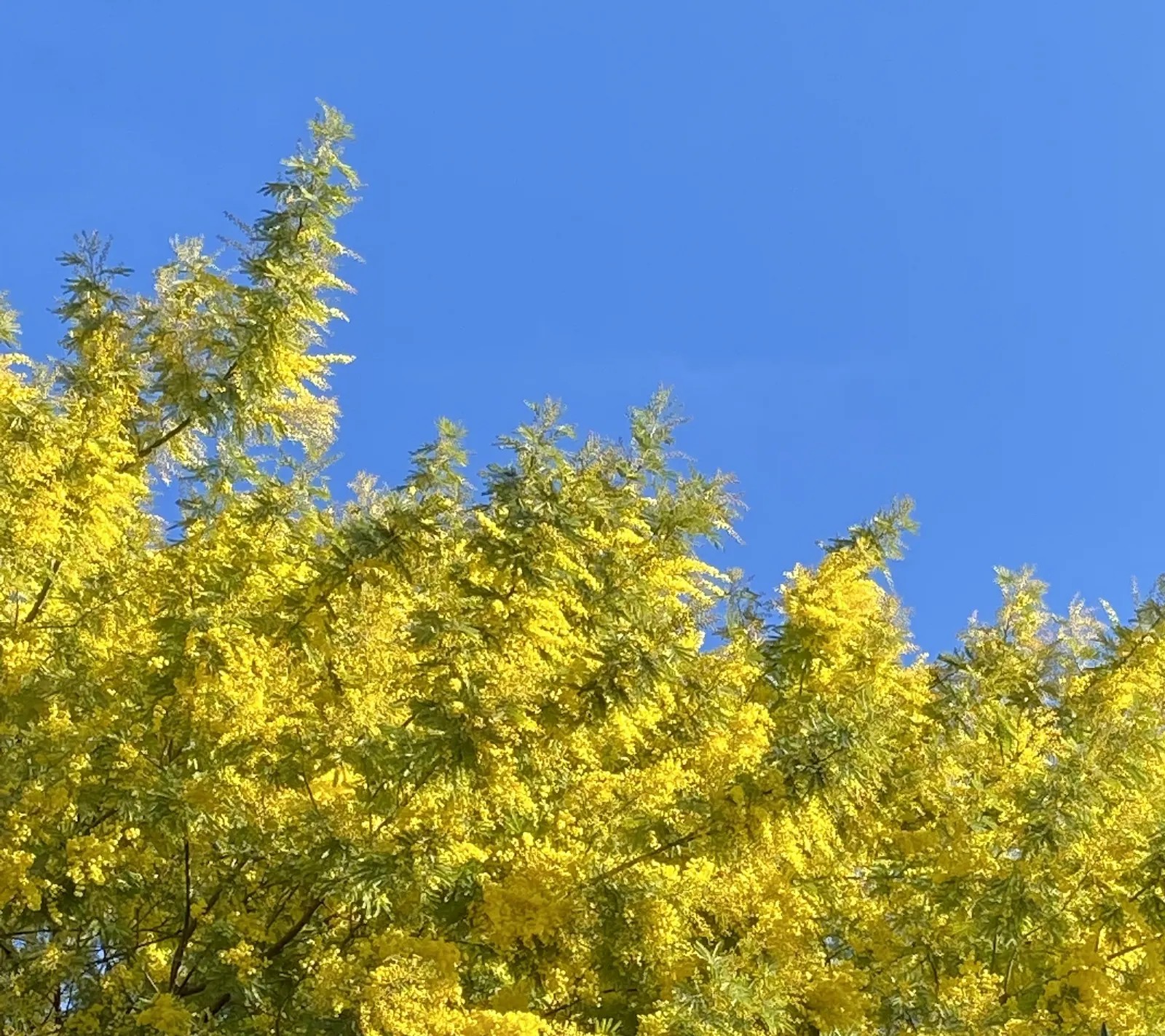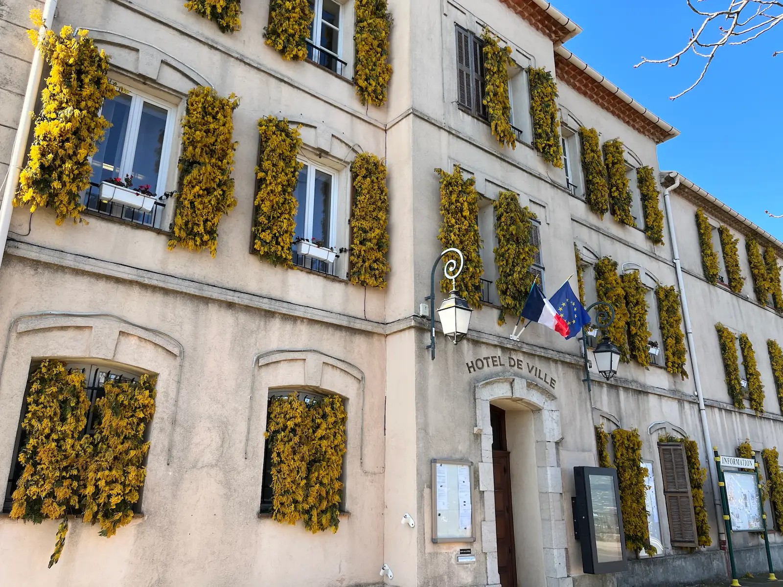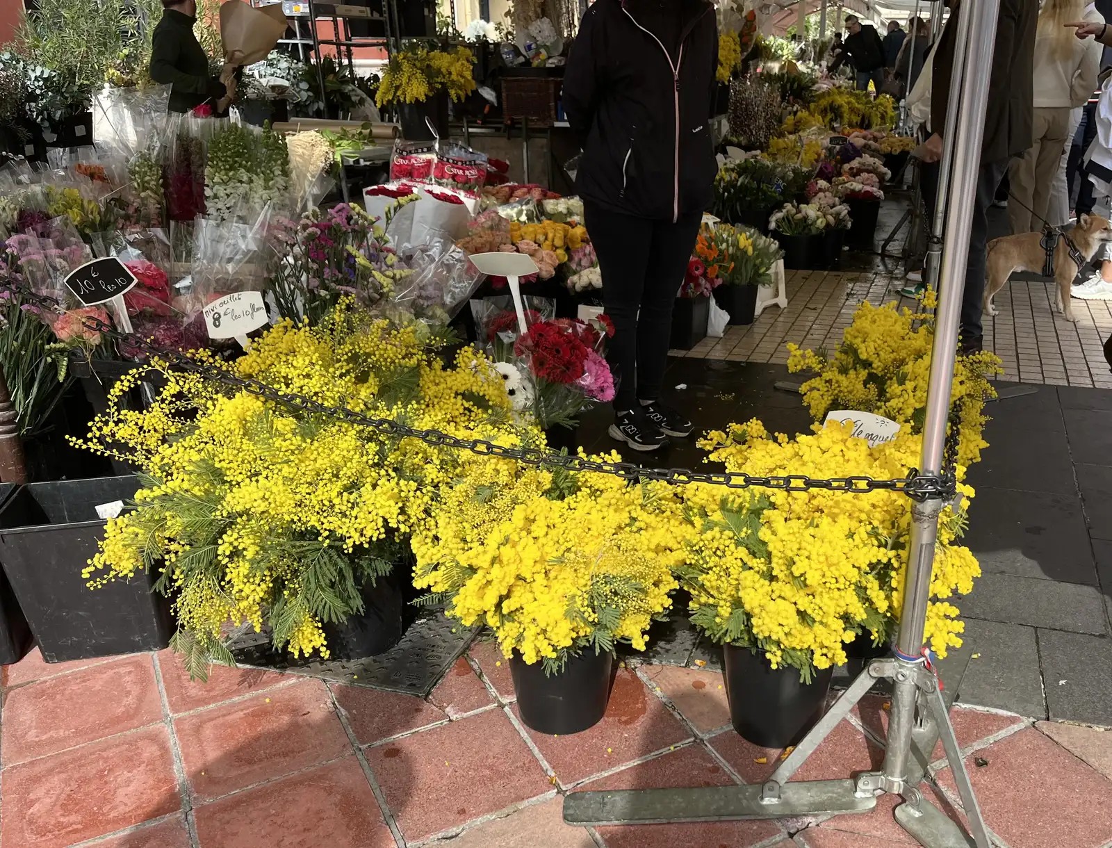 Det som här kallas för mimosa är egentligen en växt som heter silverakacia och den kom till Frankrike från Australien i mitten av 1800-talet. Den spred sig snabbt och blev en viktig ingrediens för parfymtillverkningen i Grasse. Här kallas den ”vintersolen” eftersom den blommar januari-mars.